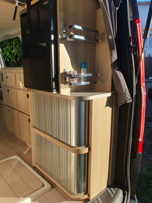 - Cuisine avec de nombreux rangements (robinet + pompe + bidons eau propre et eau sale)